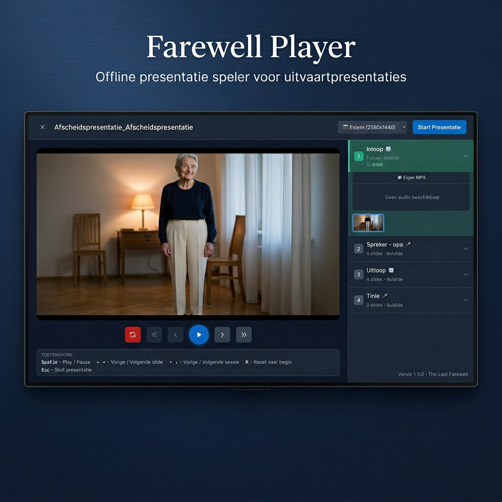 Soms werkt techniek niet mee. Het uitvaartcentrum heeft een oud systeem, de PowerPoint start niet goed, de muziek speelt niet af. De Farewell Player is uw backup. Een zelfstandig programma dat uw presentatie perfect afspeelt — elke keer.