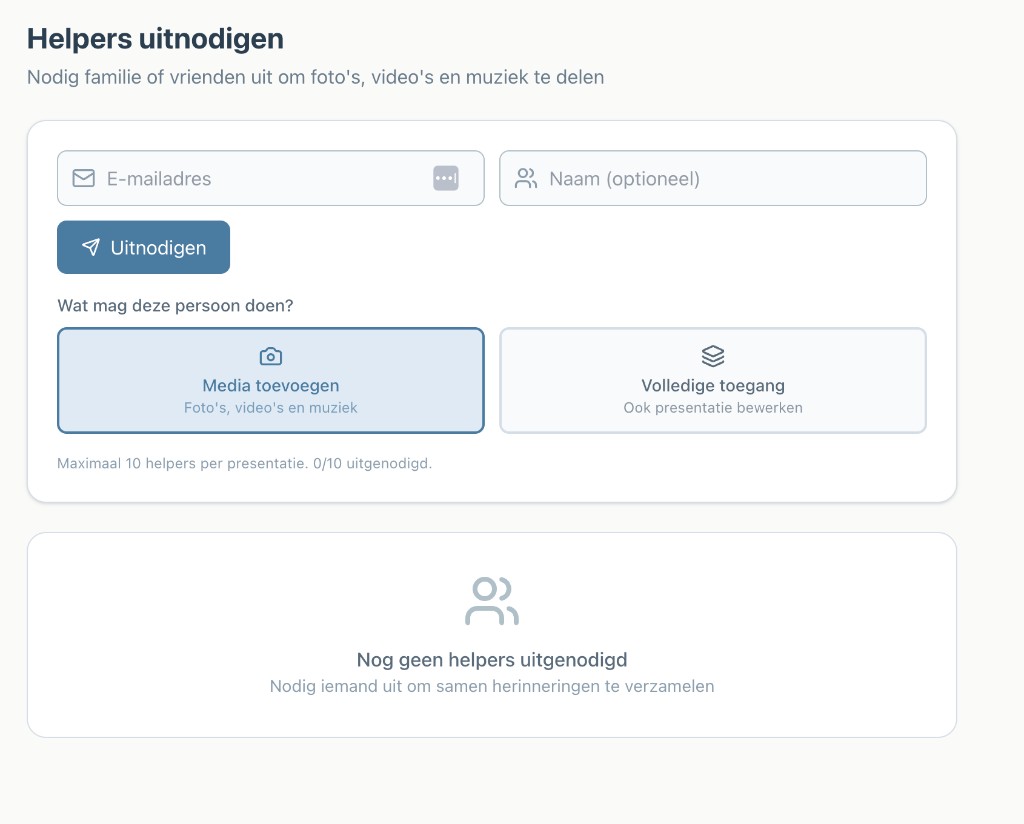 U maakt een project aan en nodigt familie en vrienden uit via e-mail. Zij ontvangen een uitnodiging, activeren hun account met één klik, en kunnen direct foto's uploaden.