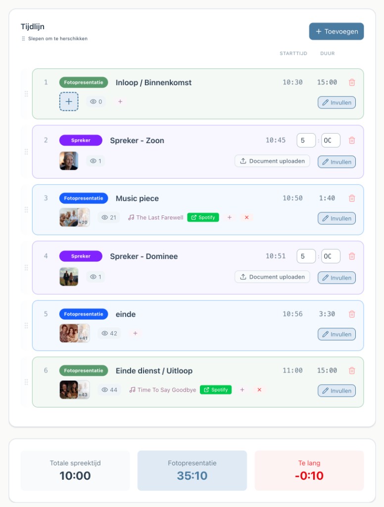 Een uitvaartdienst bestaat uit veel onderdelen: de inloop, muziek, sprekers, fotopresentatie, afscheid. Met de planning tool van The Last Farewell ziet u in één oogopslag hoe de dienst verloopt. U voegt onderdelen toe, sleept ze in de juiste volgorde, en stelt de tijdsduur in. Zo weet iedereen — u, de familie, het uitvaartcentrum — precies wat wanneer komt.
